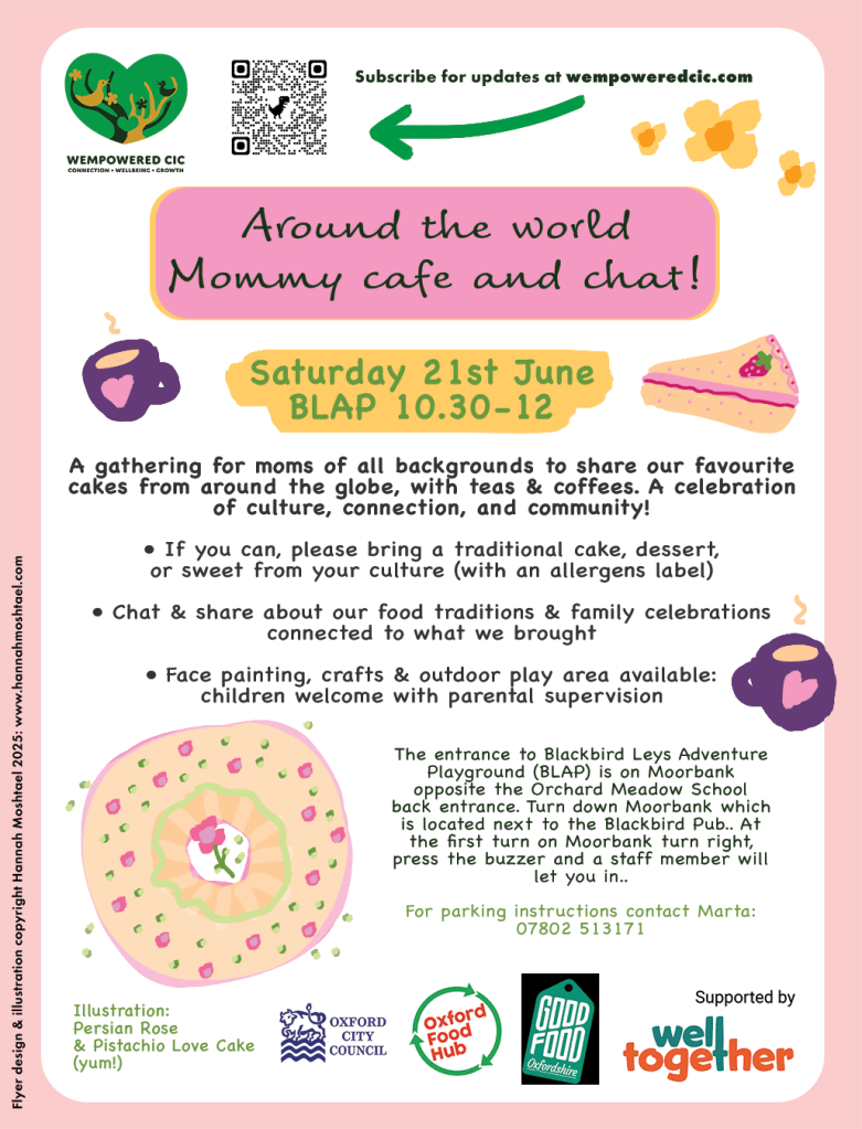 We’re looking forward to sharing cakes and stories together at our next Around the World Mommy Cafe & Chat on Saturday 21st June, 10.30-12 at Blackbird Leys Adventure Playground (BLAP)!