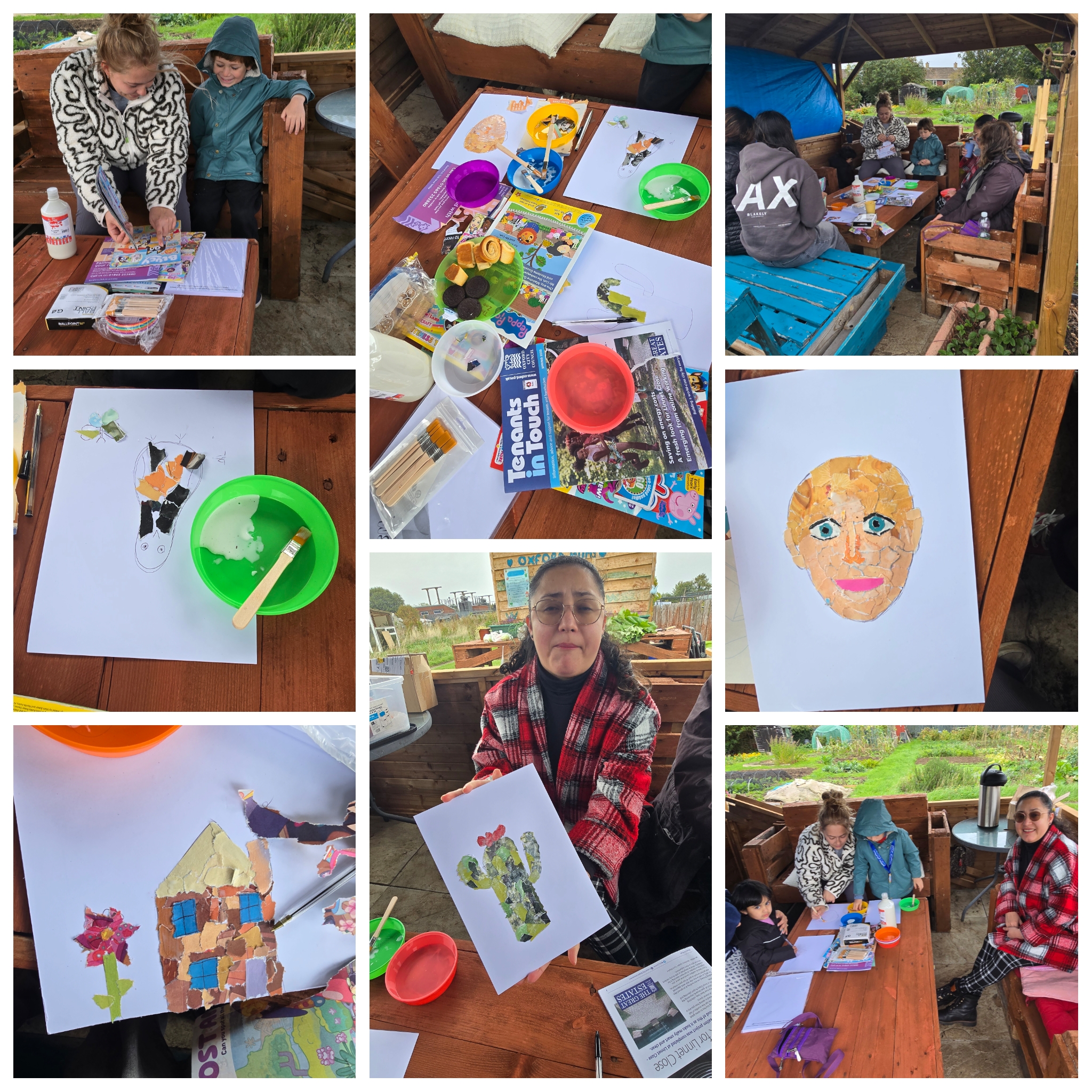 Our very first session at Wild Flowers Allotment, Blackbird Leys, was led by Emily, a young local mom and talented artist who brought such warmth and inspiration to the group. Together, we created beautiful **collages**, each one reflecting our personal journeys and the natural world around us. All the while, we sipped **hot chocolate topped with marshmallows**, sharing laughter and stories — even as we **bravely faced the raging Storm Amy** outside! It was a reminder that connection and creativity can thrive, no matter the weather.